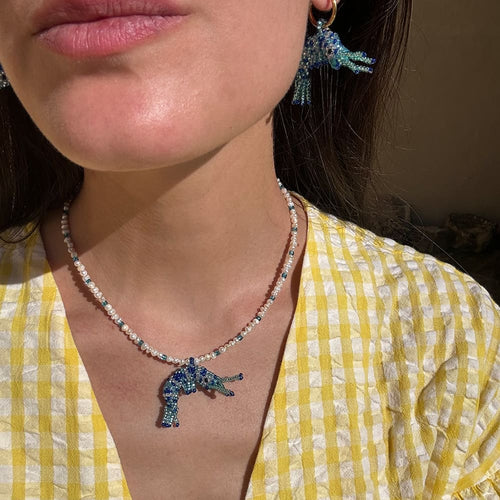 Add a splash of whimsy to your style with this adorable Baby Prawn Necklace in blue. Handcrafted by Amori Mori, each necklace is uniquely beaded to capture the charm of a tiny prawn. Playful and distinctive, it’s the perfect accessory to brighten your day with a touch of ocean-inspired fun.