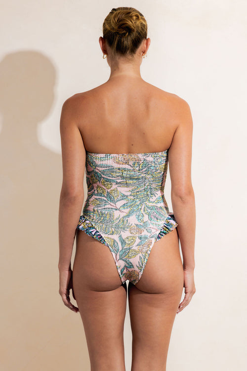 The Bluebell Maillot in our stunning Sumatra print is a timeless and elegant swimsuit featuring a strapless, classic silhouette with a high-leg cut for a flattering fit. Designed with delicate frill details at the hips, this piece adds a touch of femininity while maintaining a sleek and sophisticated look - a wonderful addition for poolside lounging or beachside glamour!