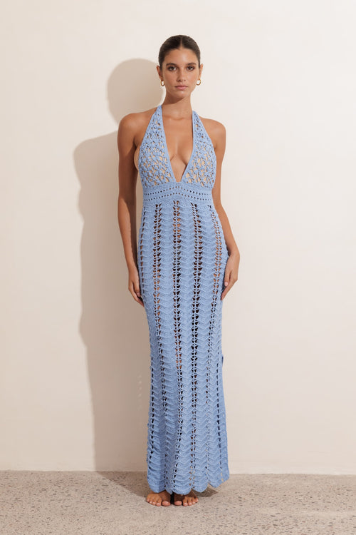 Elevate your wardrobe with this stunning hand-crocheted maxi dress in cornflower blue. The halter neckline offers a flattering silhouette, while delicate wave detailing adorns the hem for added visual interest. A lined bust provides comfort and support, and the convenient side zipper ensures easy dressing. Perfect for special occasions or elevated everyday wear, this artisan piece combines bohemian charm with timeless elegance.