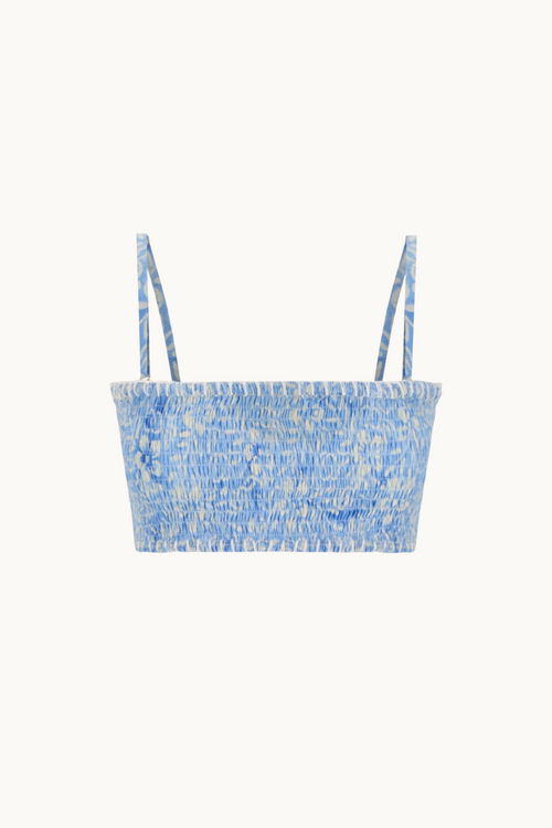Part of our batik blue collection, the Kona Kini Top is a bandeau style with adjustable shoestring straps. The bandeau features shirring and a white edging that pairs with the rest of the collection.