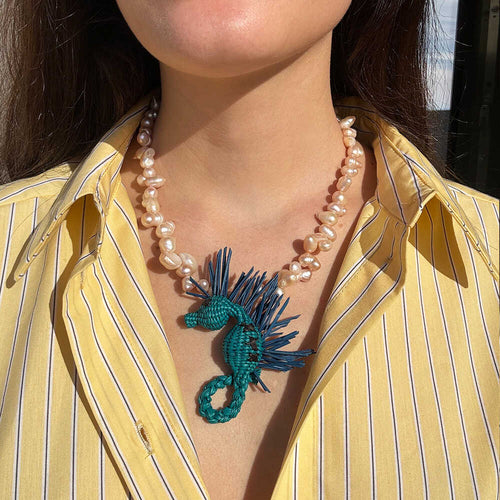 Discover the Palma Seahorse Necklace, a stunning, one-of-a-kind treasure handmade by Amori Mori. Its unique design brings a splash of ocean charm to any outfit, making it the perfect playful accessory to brighten your day. Dive into style with this delightful piece!