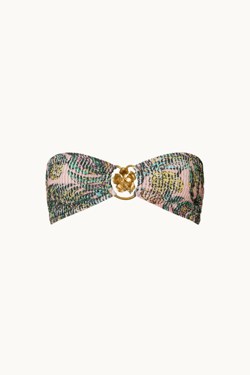Dive into summer with the Starfruit Kini in Sumatra print! This stylish bandeau kini top is the perfect way to make a splash - with its strapless design, you'll be free to relax and enjoy the beach or the pool. Not to mention, the eye-catching gold hibiscus hoop in the centre front is sure to 'beach' you compliments all day!