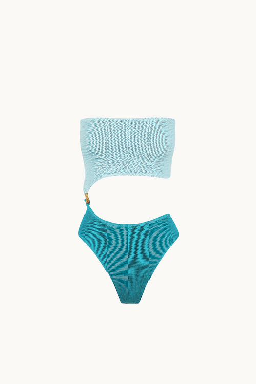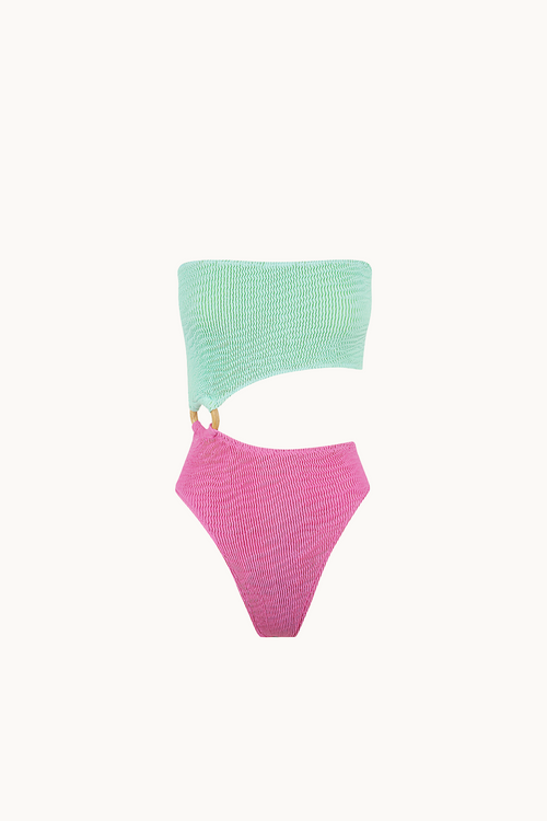The Swell Maillot is our mixed colour one piece for the La Journée collection. A strapless one piece with cut out midriff feature, and wooden side hoop. The brief has moderate coverage.