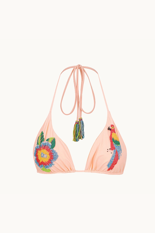 This Beaded Kini top in Blue Lagoon is ready to take you on a tropical holiday! Decked out in hand beaded tassels featuring a parrot, hibiscus and tropical fruit, this gathered triangle top is ready to sparkle. All that's missing is you!