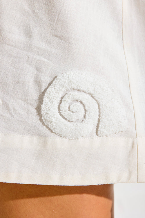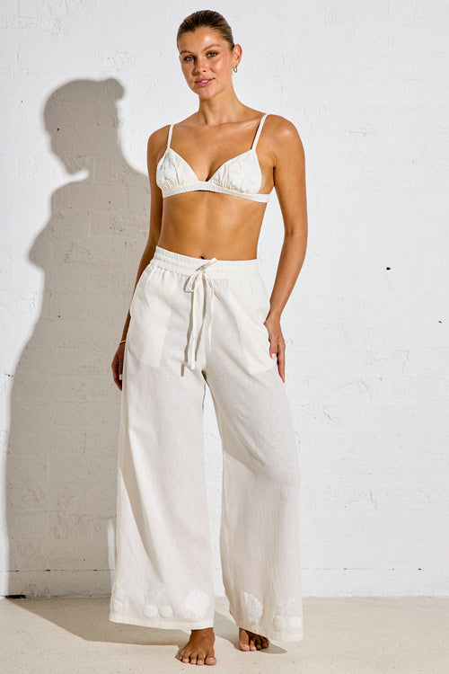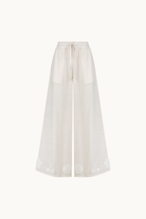 Our Hala Linen pants offer a breezy and relaxed addition to your beach or poolside paradise. With deep pockets, drawstring waist, and stunning cherry, shell and flower motifs around the ankle cuffs, you will feel comfortable and stylish with every wear.