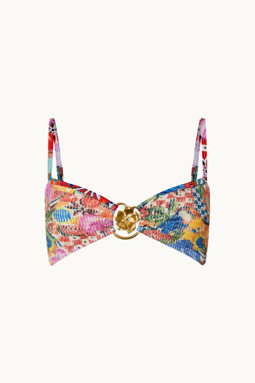 Ride the waves of fashion with the Luna Kini in our Dreamland print. Featuring eco-friendly crinkle fabric, a gold hibiscus hoop detail at the front, back clasp and adjustable thin bound straps, this elegant bikini is perfect for lounging in style. Swim sustainably with this playful and unique piece!