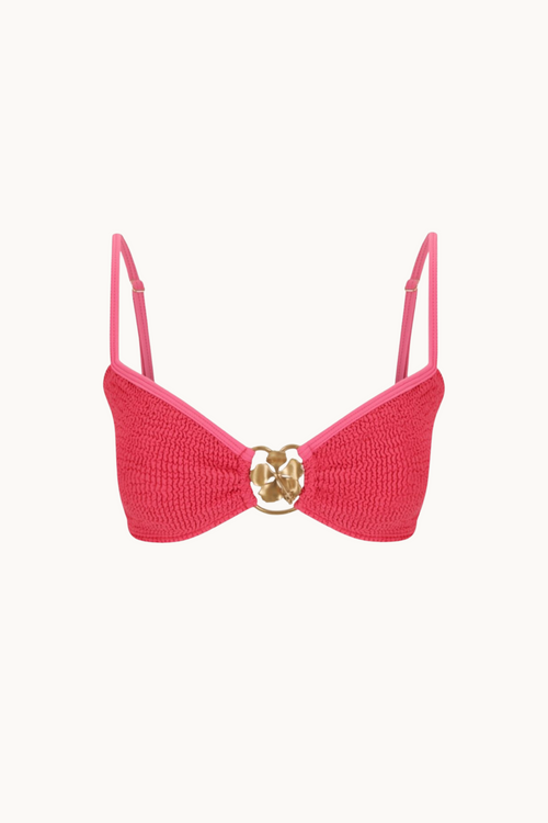 Ride the waves of fashion with the Luna Kini in Watermelon. Featuring eco-friendly crinkle fabric, a gold hibiscus hoop detail at the front, back clasp and adjustable thin bound straps, this elegant bikini is perfect for lounging in style. Swim sustainably with this playful and unique piece!