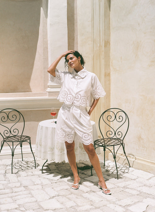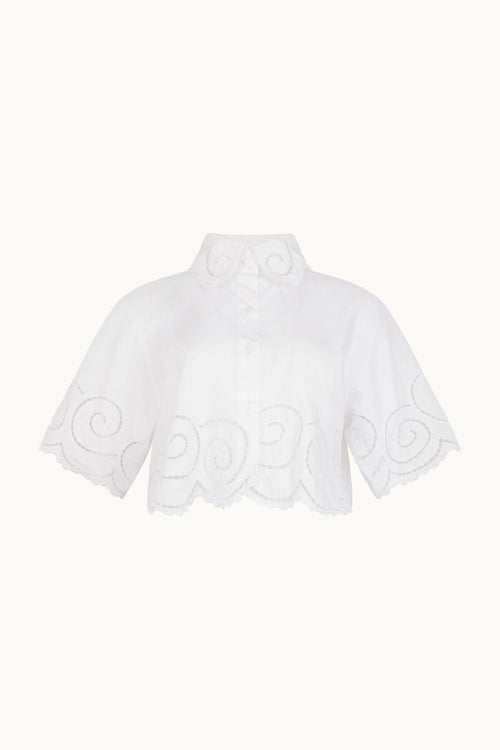 Elevate your wardrobe with this stunning hand-embroidered crop shirt, featuring intricate kerawang swirl detailing that catches the eye. The classic button-up design is enhanced with delicate embroidery at the collar, creating an effortless blend of traditional craftsmanship and contemporary style. Perfect for layering or wearing solo, this versatile piece brings artisanal charm to any outfit.
