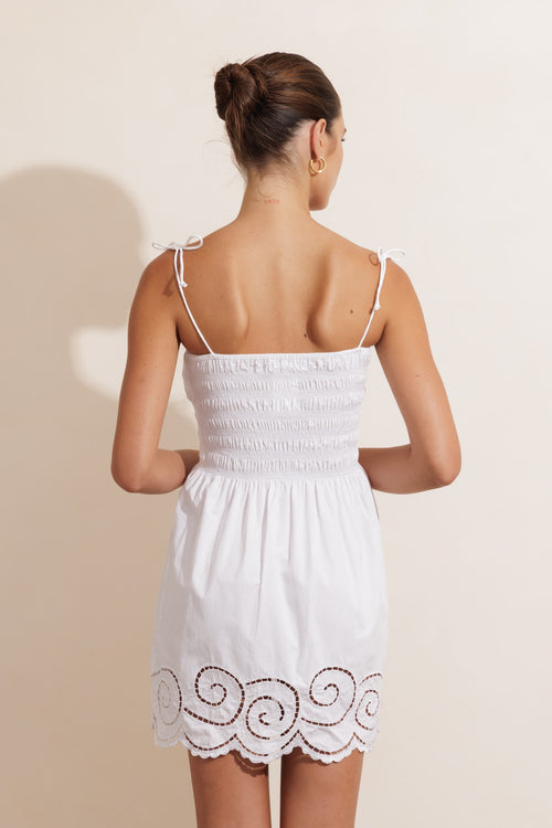 Elevate your warm-weather wardrobe with this charming mini dress crafted from breathable 100% cotton poplin. The fitted shirred bodice creates a flattering silhouette, while delicate hand-embroidered kerawang detailing adorns the swirl hem for an artisanal touch. Adjustable shoestring straps offer a customisable fit. Perfect for casual outings, beach days, or relaxed summer gatherings, this versatile white dress transitions effortlessly from day to night.