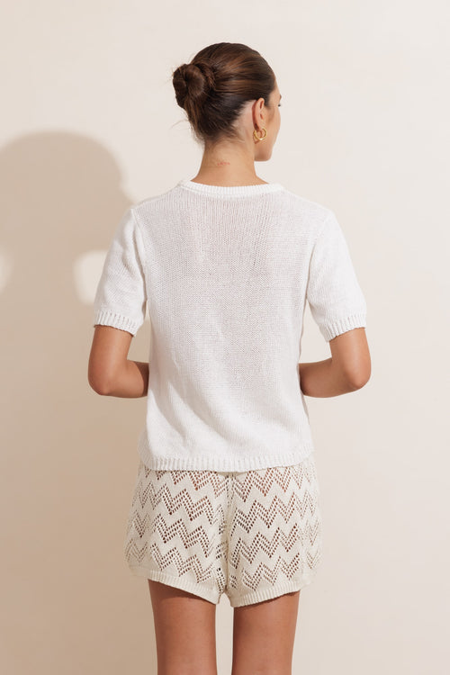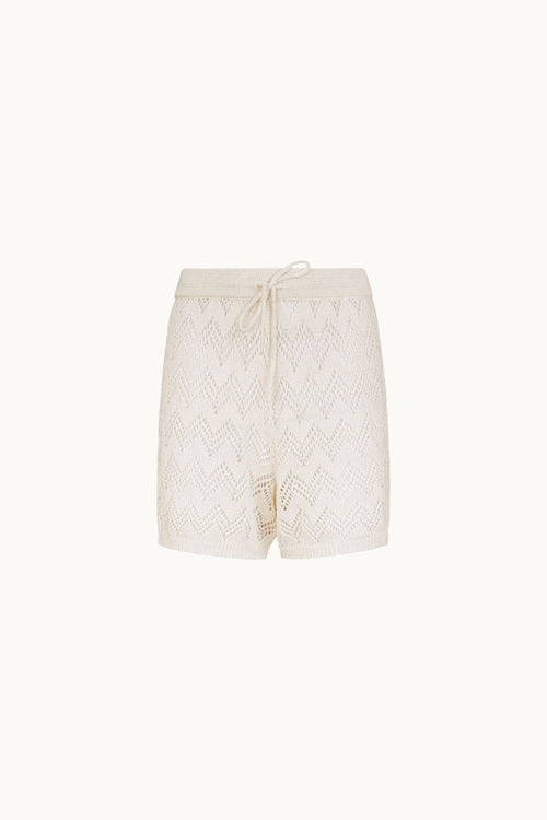 Relaxed knit shorts crafted from 100% cotton with a distinctive zig zag texture. Featuring a comfortable slouch fit and adjustable drawstring waist for a customisable silhouette. Perfect for effortless layering or standalone wear, these shorts offer breathable comfort with understated style. Ideal for warm weather dressing.