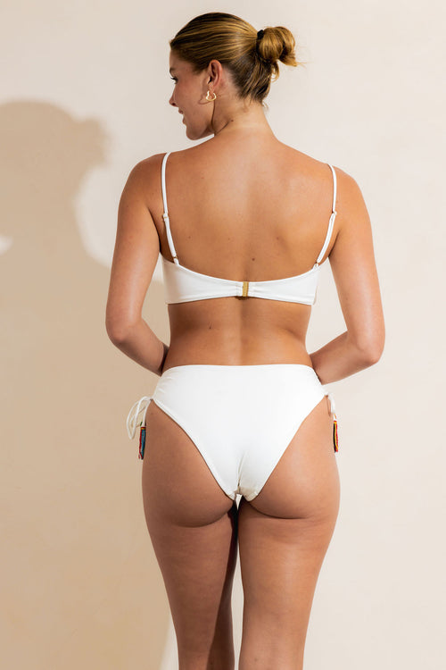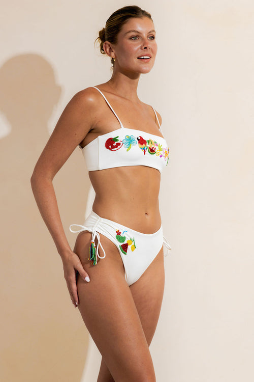 The Sumatra Beaded Brief in white is a playful low-rise, higher waisted piece featuring hand-beaded tassels and a vibrant fruit salad motif that adds a fun, fresh twist. Designed for moderate coverage, it offers a flirty yet comfortable fit perfect for adding a splash of whimsy to your lingerie collection.