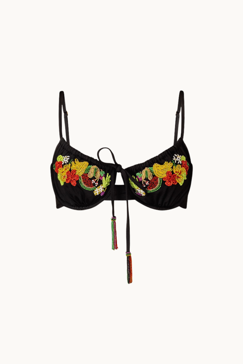 Elevate your beach vibe with the Sumba Beaded Kini Top in black. Featuring a hand-beaded fruit salad motif, this underwire top offers both support and style. Adjustable shoestring straps let you customise your fit while adding a flirty touch. Perfect for sunny days and playful moods alike!