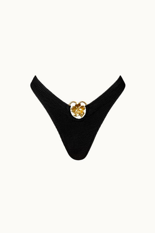 Our Wahine briefs are a low rise design with moderate coverage. They feature a gold hibiscus hoop detail at the front that adds a unique and playful flair.