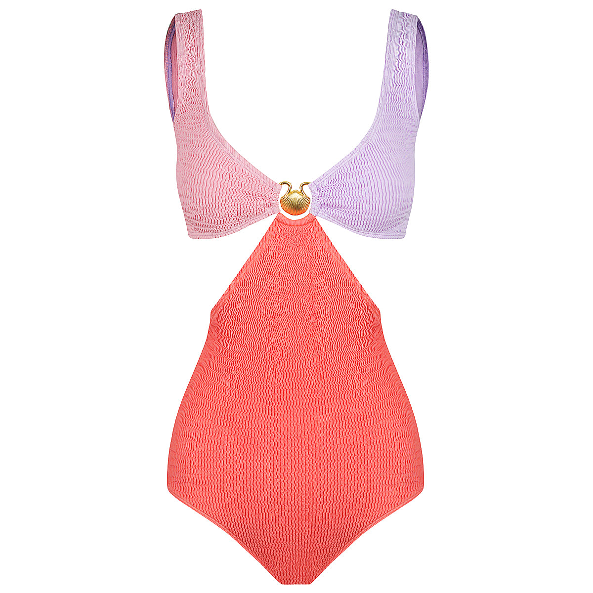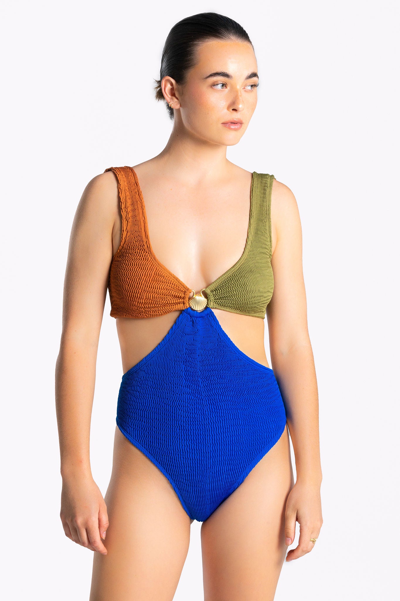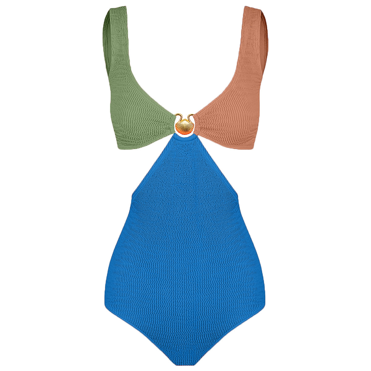 The Hamptons Maillot is our tri colour one piece. A two shoulder full piece with cut out midriff feature and front gold shell hoop. The brief has moderate coverage.